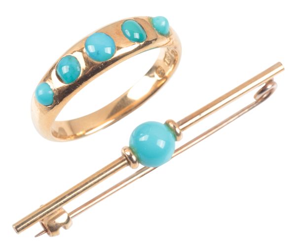 the graduated cabochons set in hallmarked 18ct yellow gold, c. 3.3 grams, ring size N, boxed; together with a bar brooch with central turquoise coloured bead, hallmarked 9ct gold, c. 103 grams (2)