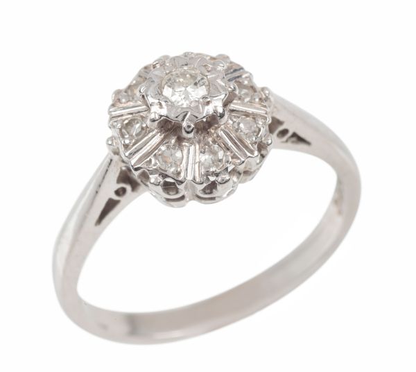 the illusion set central round brilliant cut central diamond standing proud of the surrounding eight round brilliant cut illusion set diamonds, the shank stamped 18ct, ring size O 1/2, c. 4.2 grams