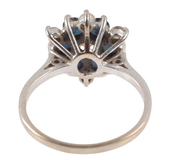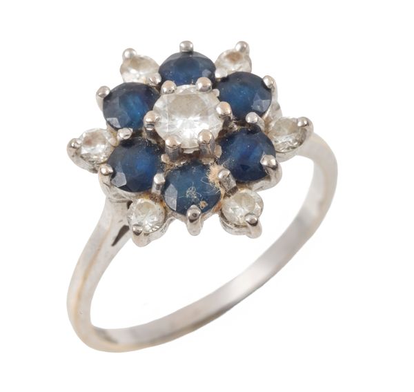 A SAPPHIRE AND DIAMOND CLUSTER RING