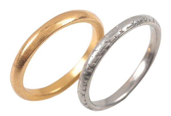 the white metal wedding band decorated with chased flower heads, the shank stamped platinum, ring size R, c. 4.9 grams, the other in hallmarked 22ct gold, ring size Q, c. 5.6 grams (2)
