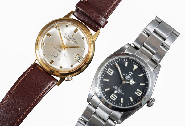 with automatic movement, black dial, silver luminous Arabic and baton numerals, silver luminous hands, case diameter approx. 34mm; together with a Matthey-Doret electronic gold plated wrist watch (2)