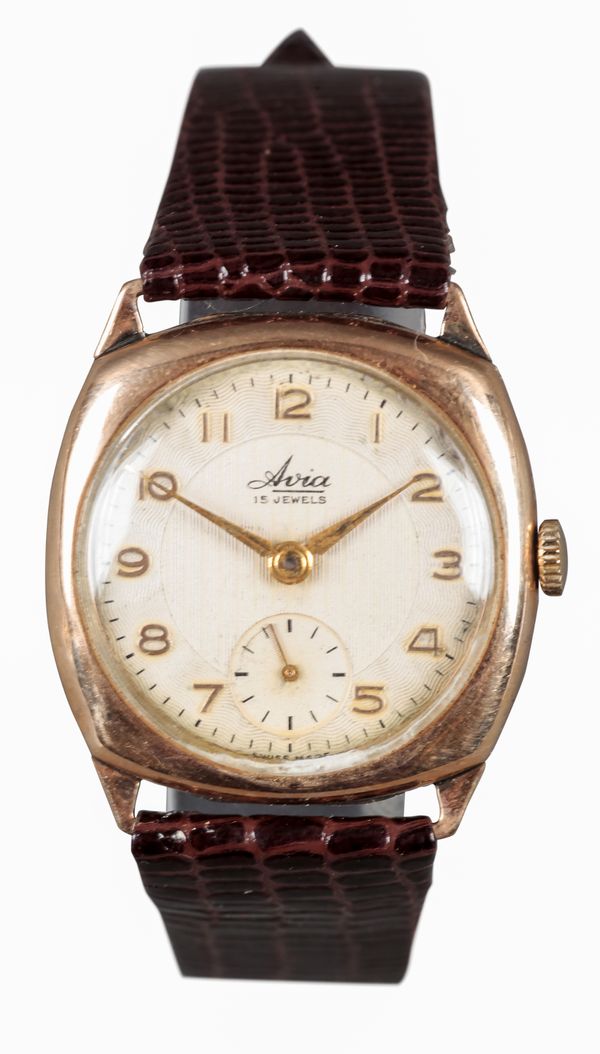 with manual wind movement, silver dial, subsidiary seconds dial, gold Arabic numerals, gold hands, on a brown leather strap, circa 1940s, case diameter approx. 28mm