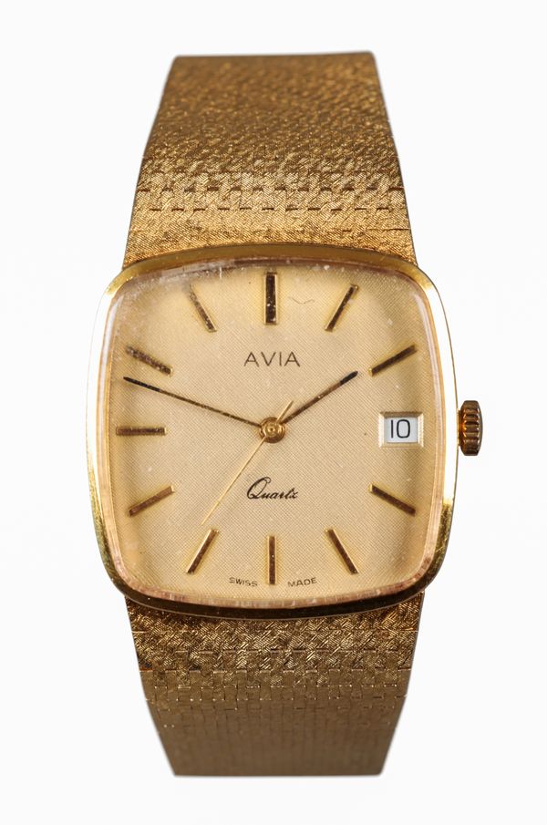 with quartz movement, gold dial, gold baton numerals, date aperture, gold hands, circa 1970s, in its original Avia case, case diameter approx. 32mm, c. 57 grams gross weight