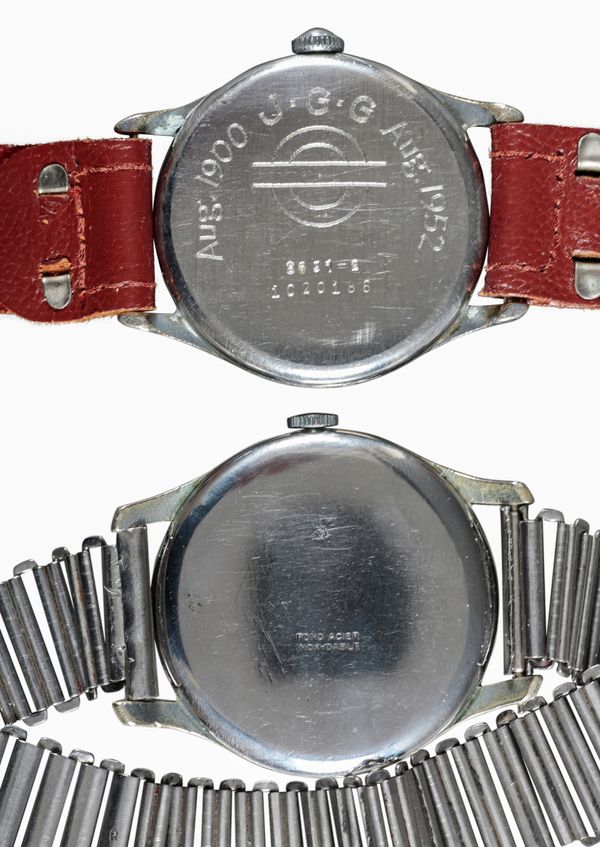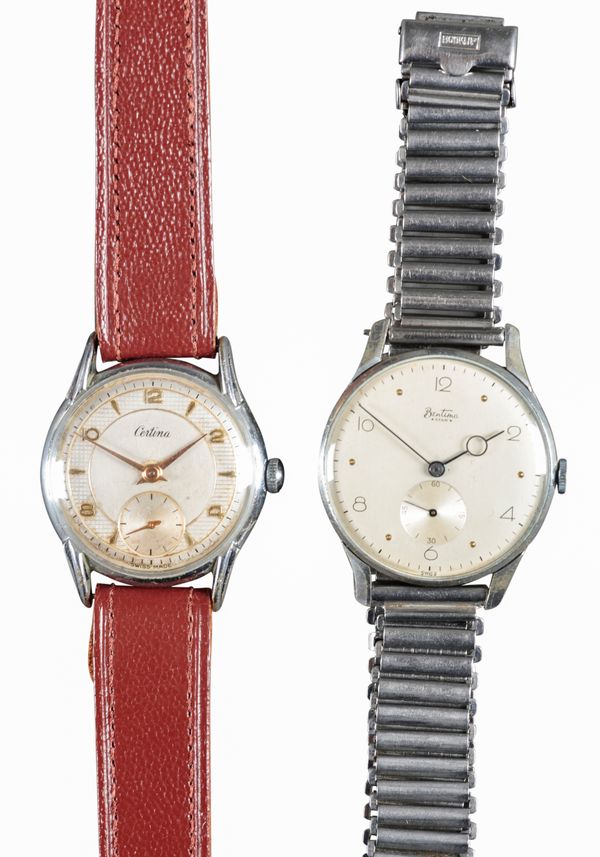 with manual wind movement, silver dial, subsidiary seconds dial, black Arabic numerals, dark blue steel hands, circa 1950s, case diameter approx. 32mm; together with a Certina stainless steel bracelet wristwatch, case diameter approx. 32mm (2)