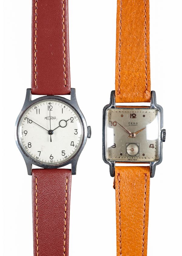 with manual wind movement, silver dial, subsidiary seconds dial, gold Arabic numerals, gold hands, on a brown leather strap, circa 1940s, case diameter approx. 25mm; together with a Medana stainless steel wrist watch with manual wind movement, silver dial, black Arabic numerals, dark blue steel hands, on a brown leather strap (2)