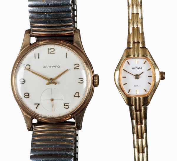 with manual wind movement, silver dial, subsidiary seconds dial, gold Arabic numerals, gold hands, case diameter approx. 32mm, circa 1960s; together with a Sekonda gold plated bracelet watch (2)