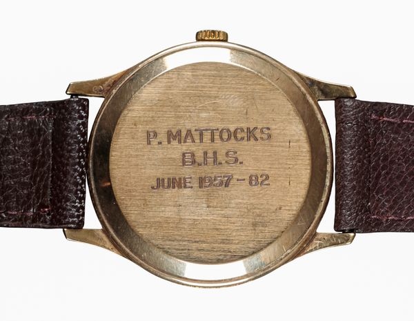 with automatic movement, grey dial, gold baton numerals, gold hands, date aperture, on a brown leather strap, caseback engraved 'P. Mattocks, B.H.S June 1957-92', case diameter approx. 34mm
