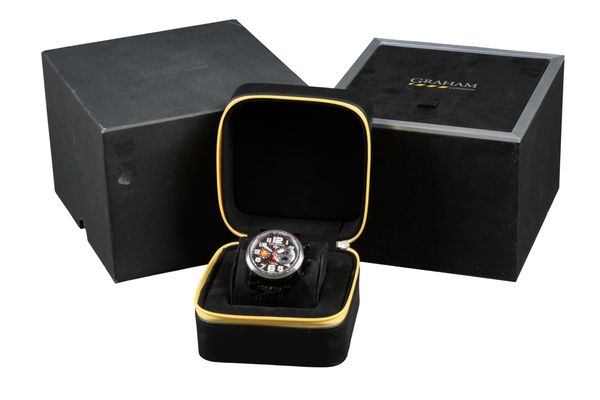 with automatic movement, black and gold checkered dial, white Arabic numerals, subsidiary dials, white luminous hands, red seconds hand, on a black leather strap, in its original watch box and outer box with certificate of origin, case diameter approx. 45mm