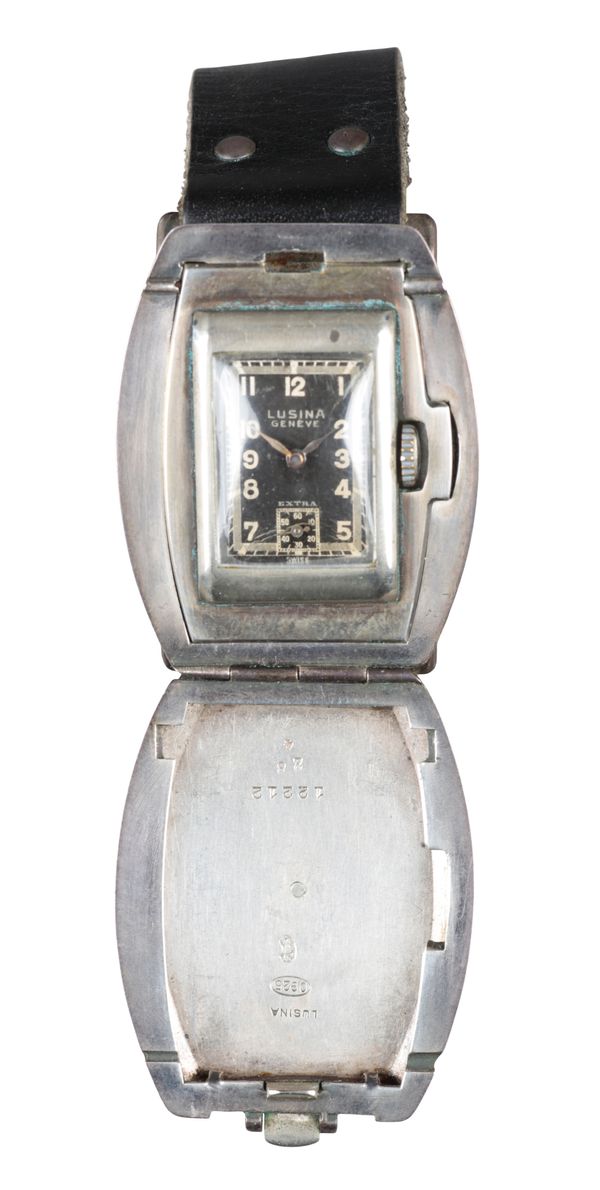 with manual wind movement, the black dial with subsidiary seconds dial, silver Arabic numerals and silver hands, on a black leather strap, engraved to the case back "General Herman Breith, no. 12212", circa 1940s, case diameter approx. 38mm