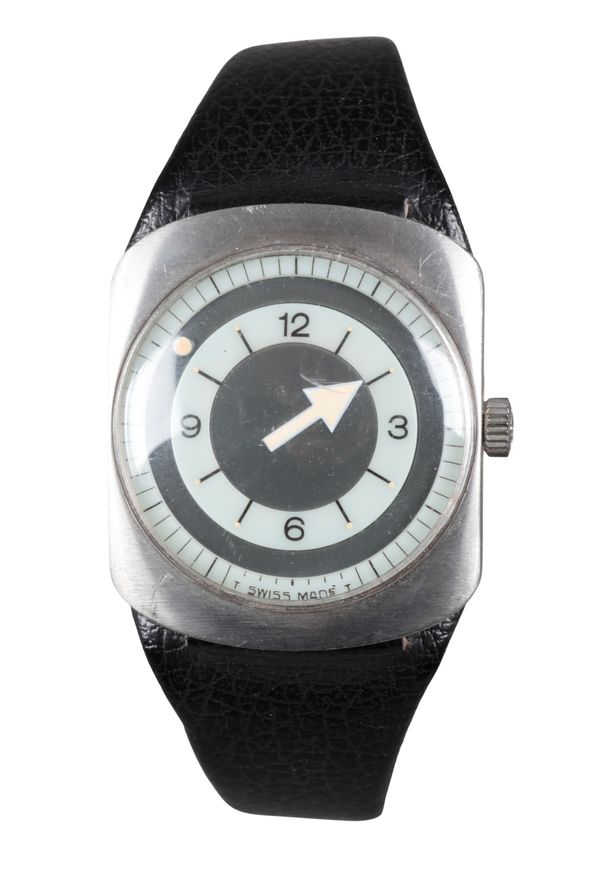 with manual wind movement, black and white two-tone dial, with orange arrow hand, on a black leather strap, circa 1970s, case diameter approx. 35mm