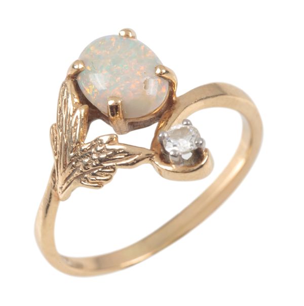 of asymmetrical design with two leaves, a cabochon opal and round brilliant cut diamond, the shank stamped 14K, ring size O, c. 2.4grams
