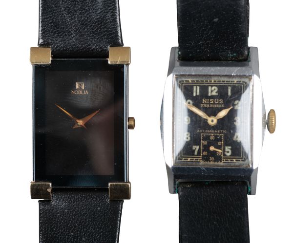 with manual wind movement, black dial, gold hands, on a black leather strap, case diameter approx. 24mm; together with a Nisus stainless steel wrist watch with manual wind movement, black dial, subsidiary seconds dial, luminous Arabic numerals, gold hands, on a black leather strap, case diameter approx. 32mm (2)