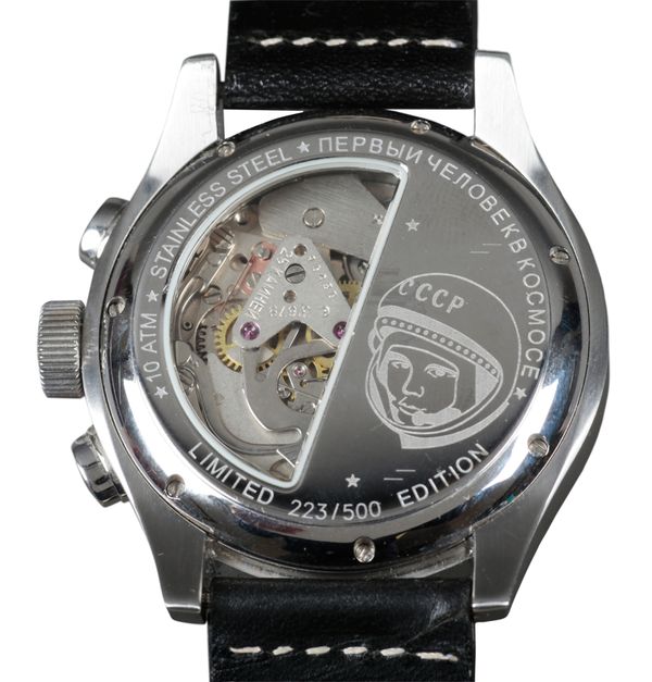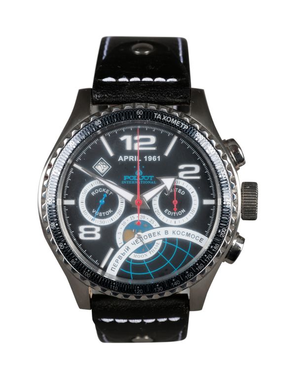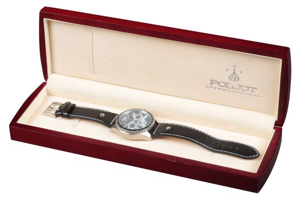 with automatic movement, black dial, triple subsidiary dials, luminous Arabic batten numerals, luminous steel hands, red seconds hand, on a black leather strap in its original Poljot International watch box and guarantee booklet, case diameter approx. 42mm
