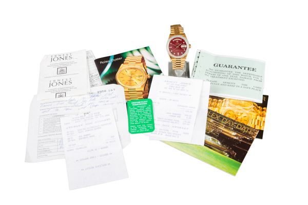 with automatic movement, ox blood dial, diamond baton numerals, gold hands, diamond encrusted bezel, with Rolex Oyster watch booklet and Rolex Service Division Guarantee, case diameter approx. 36mm