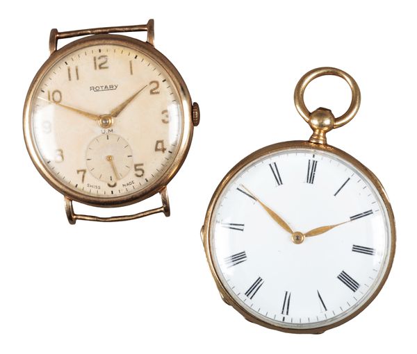 with manual wind movement, white dial, subsidiary seconds dial, gold Arabic numerals, gold hands, circa 1950s, case diameter approx. 32mm, gross weight c. 15.74 grams; together with a gold-plated open face pocket watch (2)