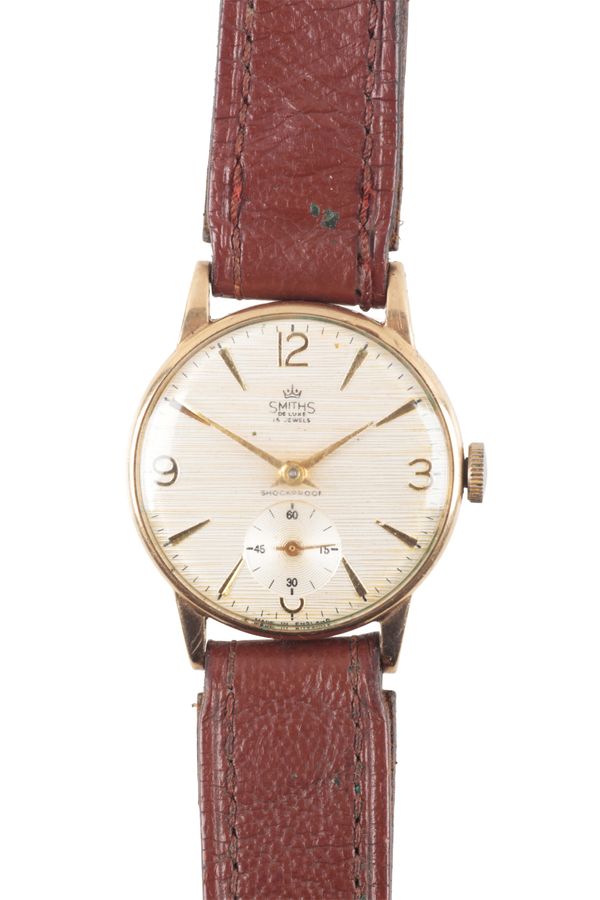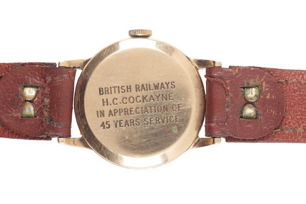with manual wind movement, silver dial, subsidiary seconds dial, gold Arabic and baton numerals, gold hands, on a brown leather strap, caseback engraved 'British Railways H.C. Cockayne in appreciation of 45 years service', circa 1950s, case diameter approx. 32mm