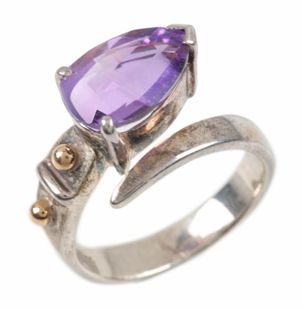 the briolette cut amethyst snake head with two applied yellow balls to the body, the ring shank stamped 925 and 750, ring size P, c. 5.9 grams