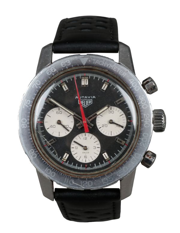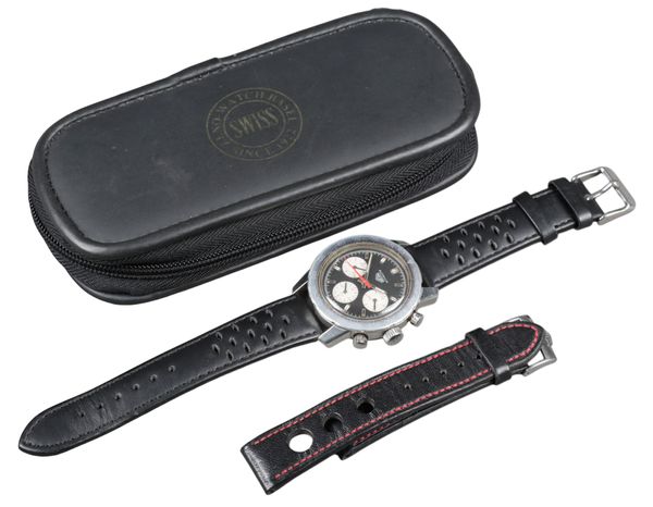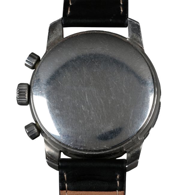 with manual wind movement, black dial, triple subsidiary dials, silver luminous baton numerals, silver luminous hands, red seconds hand, rotating bezel, on a black leather strap, circa 1960s, with spare black leather red-stitched strap, case diameter approx. 42mm
