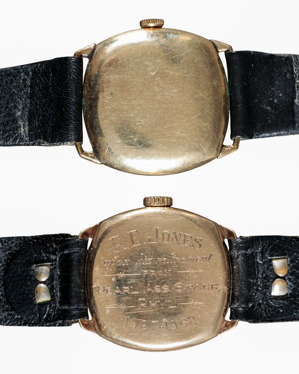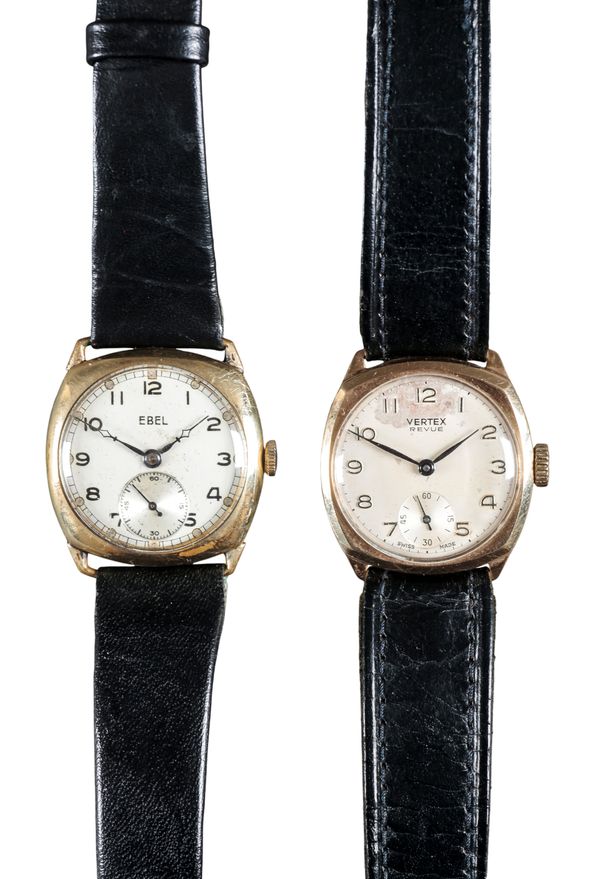 with manual wind movement, silver dial, subsidiary seconds dial, black Arabic numerals, dark blue steel hands, on a black leather strap, circa 1930s, with gilt inscription to the caseback 'R E Jones upon his retirement from Pearl Associates Staff 1927-1982', case diameter approx. 25mm; together with an Ebel gold plated wristwatch, circa 1930s (2)