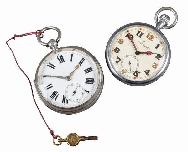 with keyless wind movement, white dial, subsidiary seconds dial, black and luminous Arabic numerals, dark blue steel luminous hands, caseback engraved with military crow's foot, engraved with the initials 'G.S.T.P', case diameter approx. 50mm; together with a silver open face pocket watch (2)