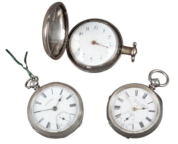 with key wind movement, white enamel dial, black Arabic numerals, gold hands, case diameter approx. 55mm; together with two other open-faced silver cased pocket watches (3)