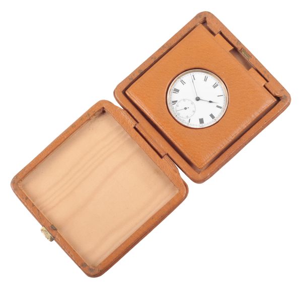 with keyless wind movement, white enamel dial, subsidiary seconds dial, black Roman numerals, dark blue steel hands, stamped GS to the watch case, with a light brown leather pig skin travel case, case diameter approx. 45mm, c. 68.86g gross weight