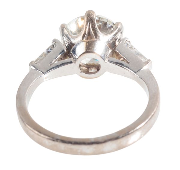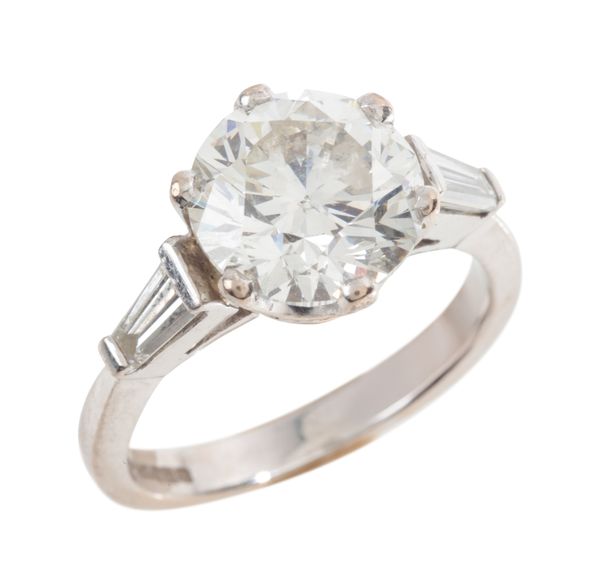with tapering baguette cut diamond shoulders, the round brilliant cut c. 2.67 carats, set in hallmarked 18ct white gold, ring size L, c. 5.2 grams