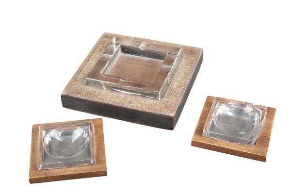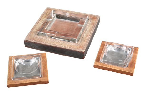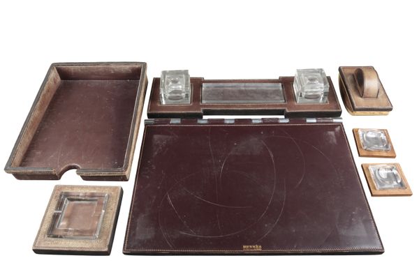 comprising pad, 55cm x 36cm, desk tidy, pair of inkwells, ash tray, paper tray and ink blotter, complete with Baccarat glass liners and receipts