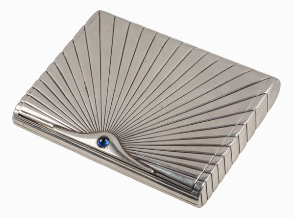 A SILVER CIGARETTE CASE WITH ROUND CABOCHON SAPPHIRE THUMB PIECE