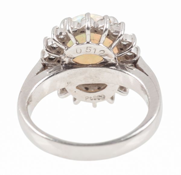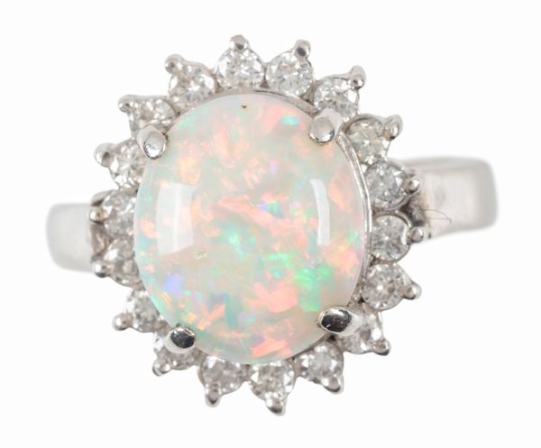 the oval cabochon opal c. 11mm x 9.6mm, surrounded by round brilliant cut diamonds, c. 0.54 carats combined, the shank stamped P900, ring size c. J, c. 9.4 grams