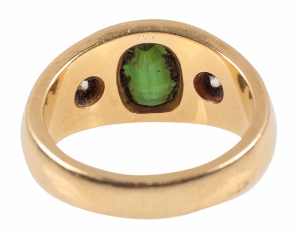 the oval mixed cut tourmaline flanked by two brilliant cut diamonds in hallmarked 18ct yellow gold, ring size S, c. 15.4 grams
