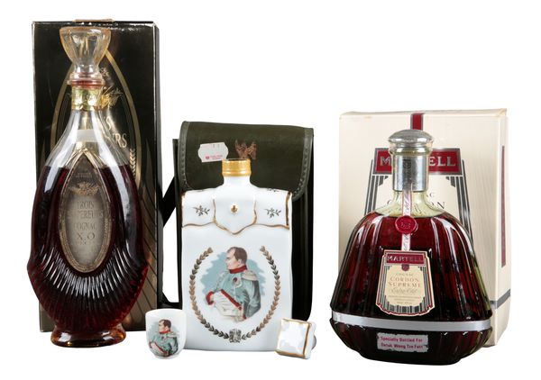 one 70cl glass decanter, boxed; together with Trois Empereurs XO Special cognac, one 70cl glass decanter, boxed; and a Limoges porcelain decanter containing Cognac, with porcelain tumbler, stopper and case (3)