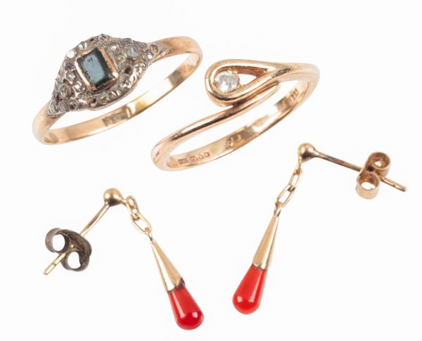 one in the form of a snake set with an old cut diamond, hallmarked shank, ring size L, the other set with rose and single cut diamonds, the shank stamped 9ct, ring size O; together with a pair of 9ct mounted drop earrings set with amber coloured paste, c. 4.2 grams gross (3)