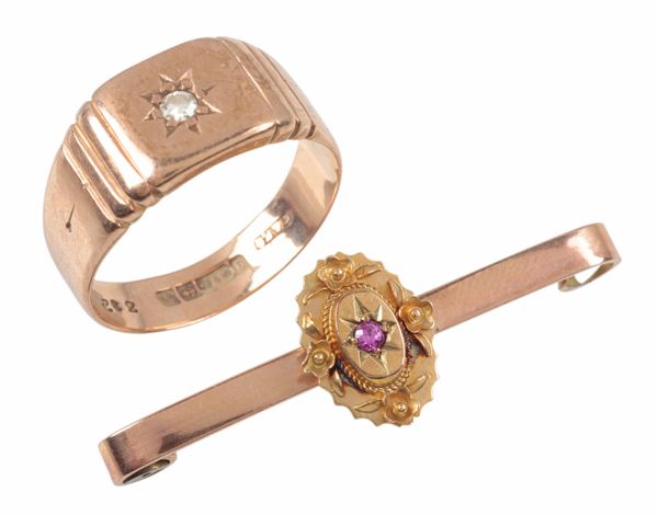 hallmarked 9ct gold, ring size R; together with a ruby set bar brooch, the oval panel stamped 15ct and the bar brooch stamped 9ct, c. 7.6 grams gross weight (2)