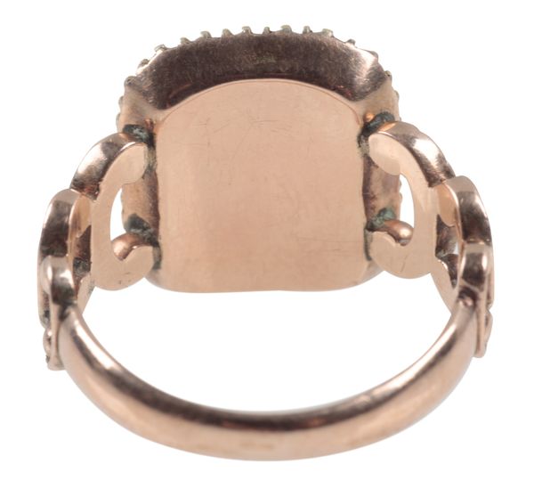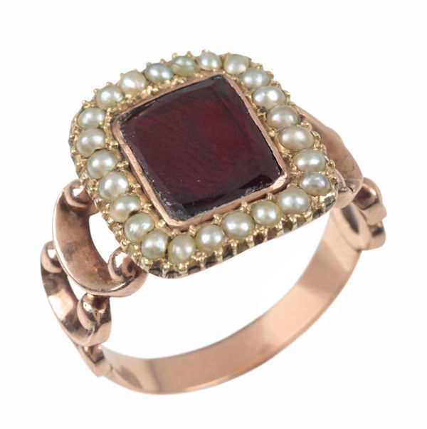 closed back set with a garnet surrounded by seed pearls with three decreasing C scrolls to each shoulder, unmarked, surface testing as 9ct, ring size P, c. 4.7 grams