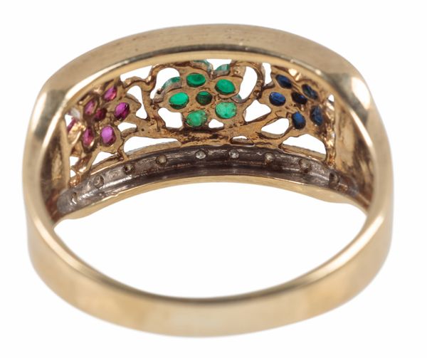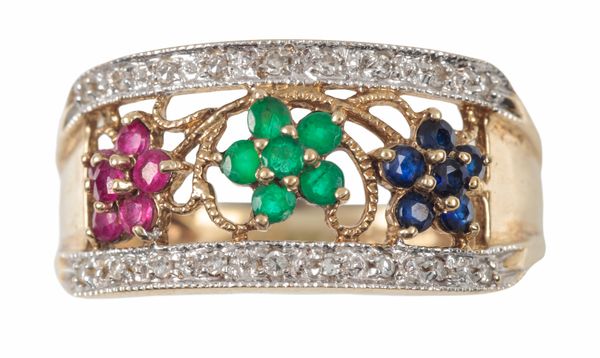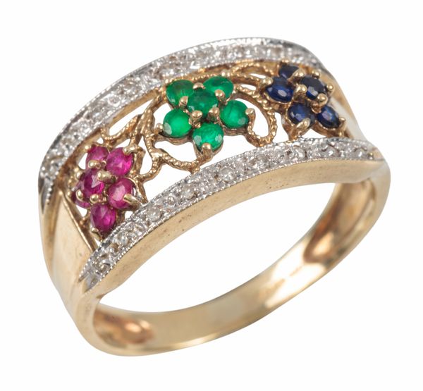 A SAPPHIRE, RUBY, EMERALD AND DIAMOND DRESS RING