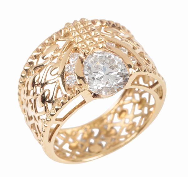 the centre round brilliant cut stone c. 1.90 carats surrounded by six further round brilliant cut sones, c. 0.25 carats combined, in a pierced setting, unmarked, surface testing as 18ct, ring size O 1/2, c. 6.6 grams