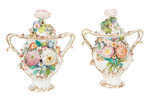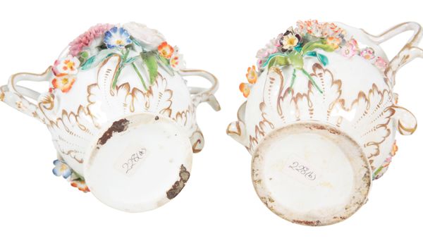 19th century, decorated throughout with polychrome encrusted flowers and flanked by foliate twin strap handles, 17cm high x 14cm wide x 11cm deep (2)