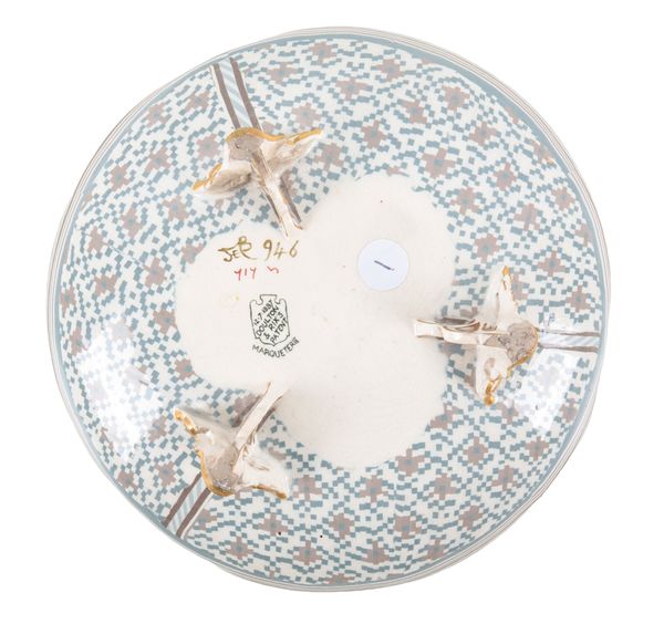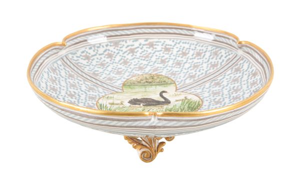 painted by Florence Barlow, the underside inscribed 'FEB 946' and '717', the central cartouche depicting a black swan within a lobed trefoil dish raised on three gilt rococo style feet, 6cm high x 20cm diameter Provenance: The Cosgrove Collection.