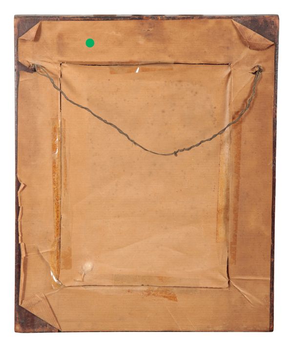 depicted three-quarter length, a landscape beyond, oil on metal, 25.5cm x 19cm