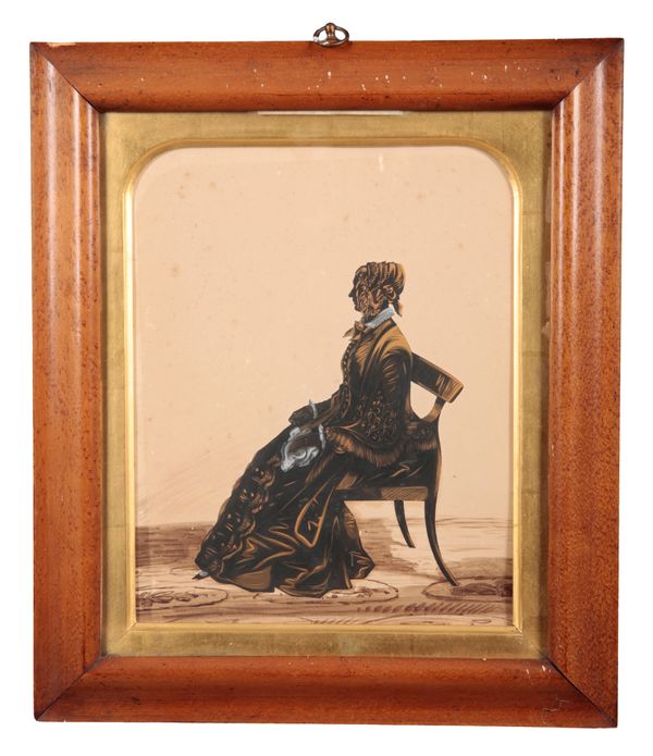 watercolour with pen and ink on paper laid to canvas, 43cm x 57.5cm; together with a 19th century silhouette portrait of a seated lady, 28cm x 22cm (2)