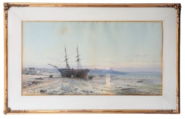 GEORGE WOLFE (1834-1890) A beached sailing vessel with a coastal town beyond
