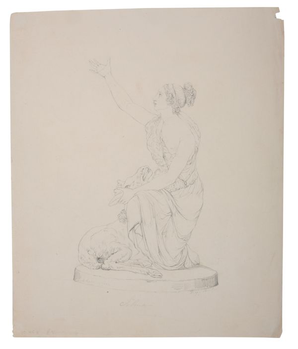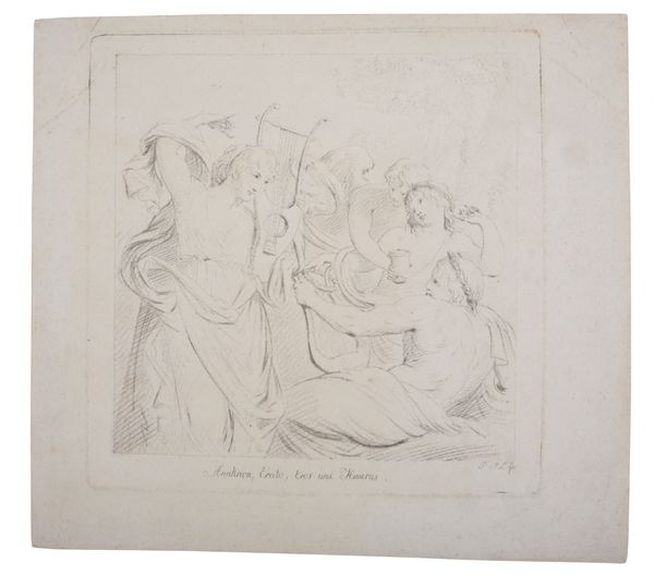in the manner of a frieze, pen and ink on paper laid to card, diameter 38.5cm; together with two drawings and an etching depicting classical subjects (4)