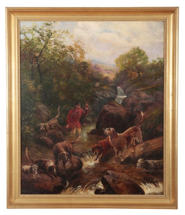 1912, depicting huntsmen and hounds by a stream, signed and dated lower left, oil on canvas, 75cm x 61cm Provenance: Deer Park, High Bickington, Devon.