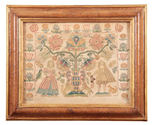 dated 1671, depicting King Charles II and Catherine of Braganza attended by various animals and insects, a blossoming tree to the centre, within a border of flowers, 33cm high x 44cm wide