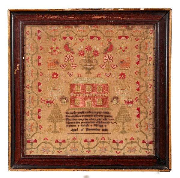 worked by 'Sarah Wragg, aged 16, November 1840' in polychrome threads with a central brick red house flanked by urns and bee hives either side, above a secular verse on cherishing youth, encircled with a geometric flower border, 42cm x 42.5cm