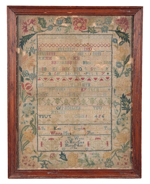 'the work of Mary Cale, aged nine, 1734', in polychrome threads, the demarcated central rectangular panel containing horizontal bands of geometric shapes, the alphabet, and verse, all surrounded by a meandering border of flowers and foliage, 41.5cm x 31cm