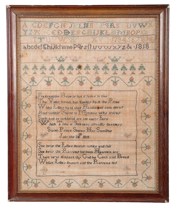 'Sarah Prince Shorey, Her Sampler, July 24th, 1818', in polychrome thread with alphabet and numbers in horizontal formation to the top with lines of coronets and conifers beneath, with secular and religious verse to the bottom, all contained within foliate and floral borders, 49.5cm x 39.5cm