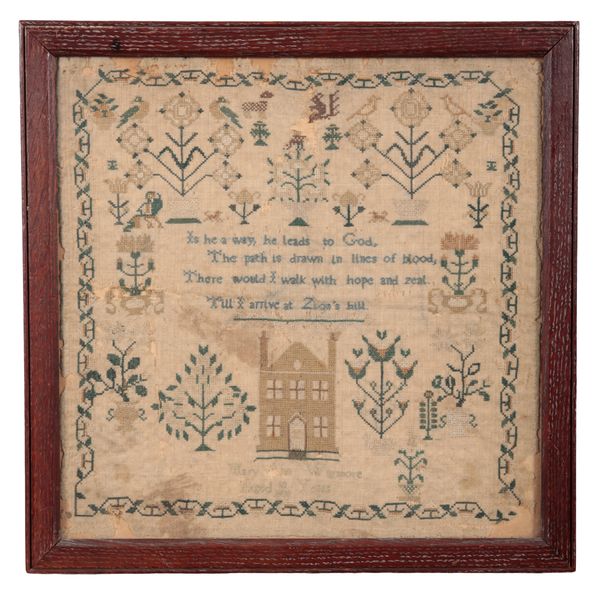 worked by 'Mary Ann Wigmore, aged 10 years, 1830', in subdued polychrome threads with two chimneyed house, below religious verse, surrounded by birds, trees and animals, all contained within meandering foliate and floral border, 32.5cm x 32.5cm