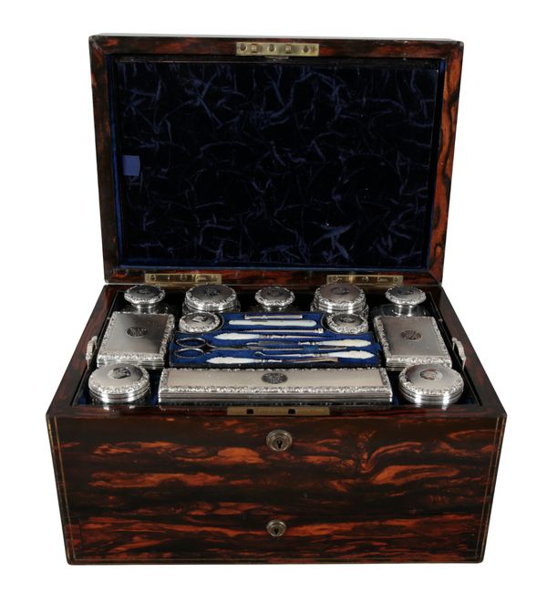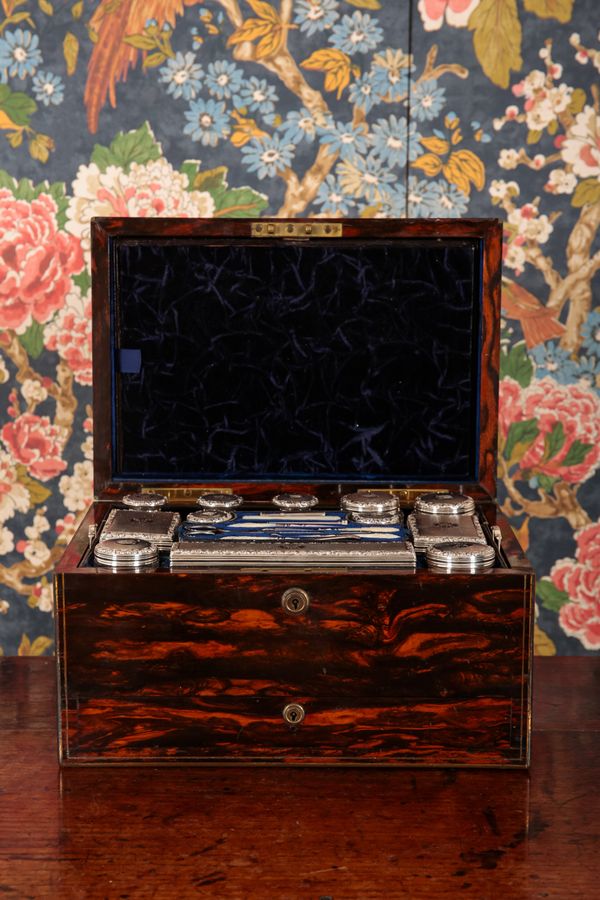 the monogrammed case opening to an interior fitted with conforming silver topped boxes and jars, a mother of pearl handled sewing kit, and a dressing mirror falling from the inside of the lid, the single drawer beneath opening to a leather writing surface, 20cm high x 33.5cm wide x 23.5cm deep
